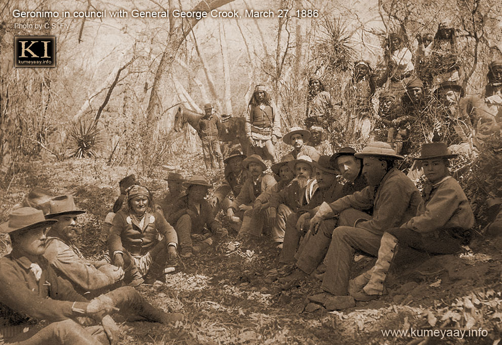 Photo caption: Geronimo pictured in council with General George Crook, March 27, 1886 (photo likely by C.S. Fly). Some of the US soldiers faces in this image appear to have been "worked on"...it's hard to guess when this was done, but most likely the retouching was done on an original print, copied into a new negative and reprinted at the turn of the 20th century long before Adobe Photoshop® was invented. Historical info: Neg. 4300-A, SPC 016048.06