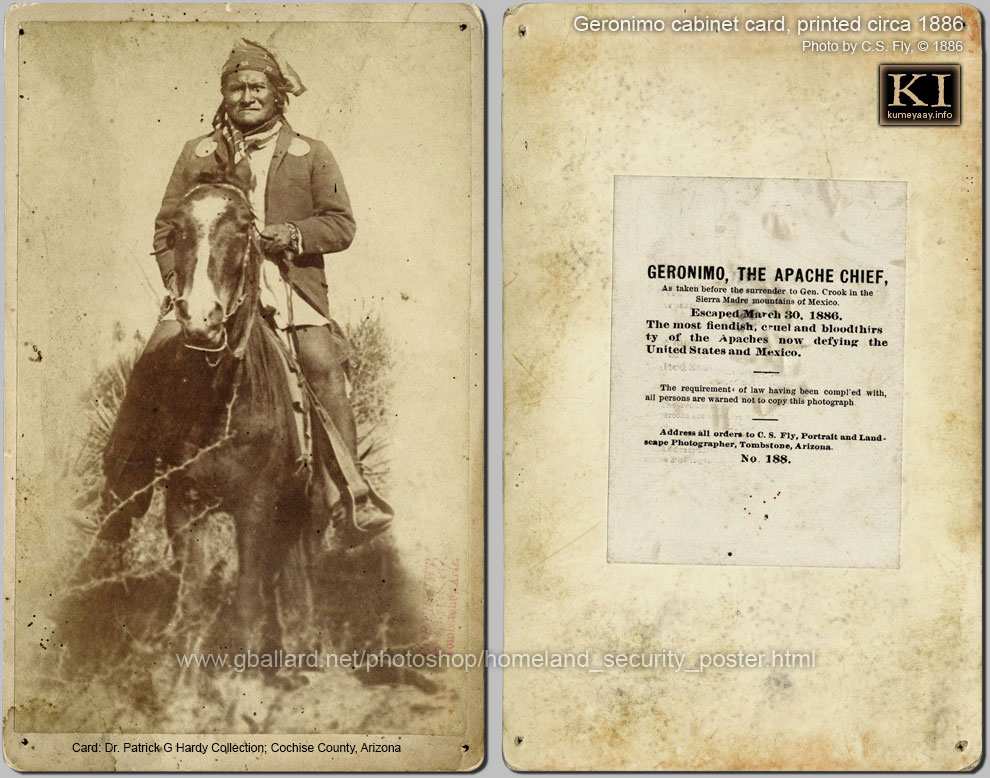 The Geronimo photograph used in G. BALLARD's "Homeland Security" poster was scanned from an original C.S. Fly photographic print cabinet card (circa 1886). Below is a scan of the original 1800s copyright label attached to the backside of the original Geronimo cabinet card used to make the Homeland Security poster. Original "No. 174" Geronimo cabinet cards in this condition have sold for $10,000 USD on national auction websites they are very rare and highly collectable in this remarkable condition.