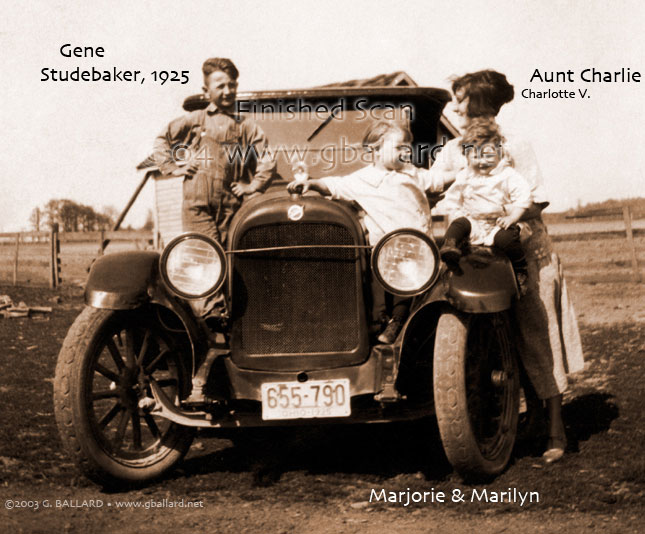 Gene, Marjorie, Marilyn Buettner pose with Studebaker and Aunt Charlotte V. Cochran on family farm,